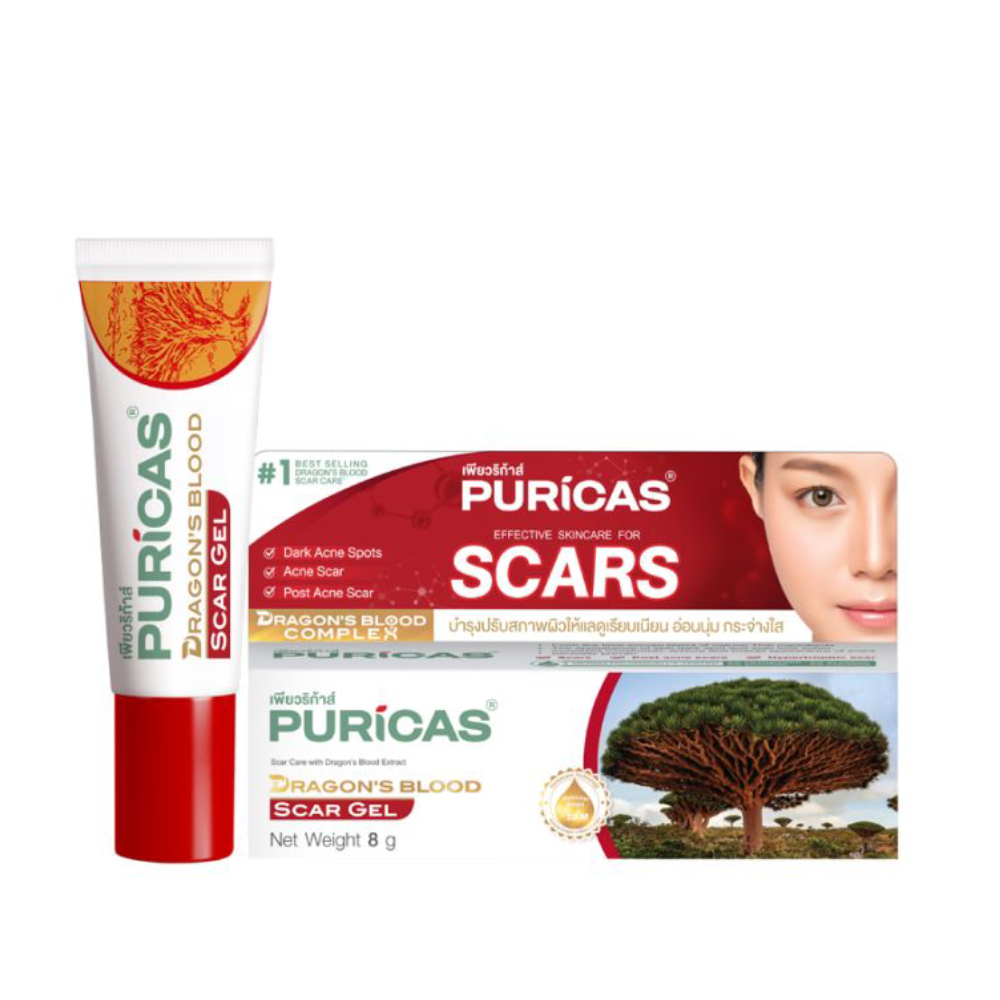 เพียวริก้าส์ เจลรักษาแผลเป็นจากสารสกัดดราก้อนบลัดเข้มข้น ช่วยทำให้รอยแผลเป็นอ่อนนุ่มและเรียบเนียนขึ้น รอยแผลเป็นจะแลดูจางลง หากใช้ผลิตภัณฑ์อย่างต่อเนื่อง ช่วยลดรอยแผลเป็นหลายชนิด ได้แก่